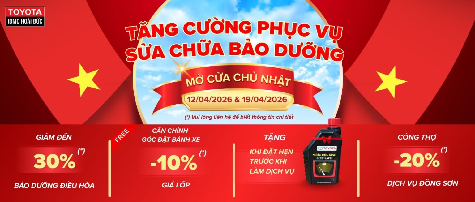 Tăng cường dịch vụ sửa chữa bảo dưỡng phục vụ khách hàng vào 2 ngày chủ nhật 12/04/2026 & 19/04/2026, chuẩn bị cho kỳ nghỉ dài chào đón Đại lễ.