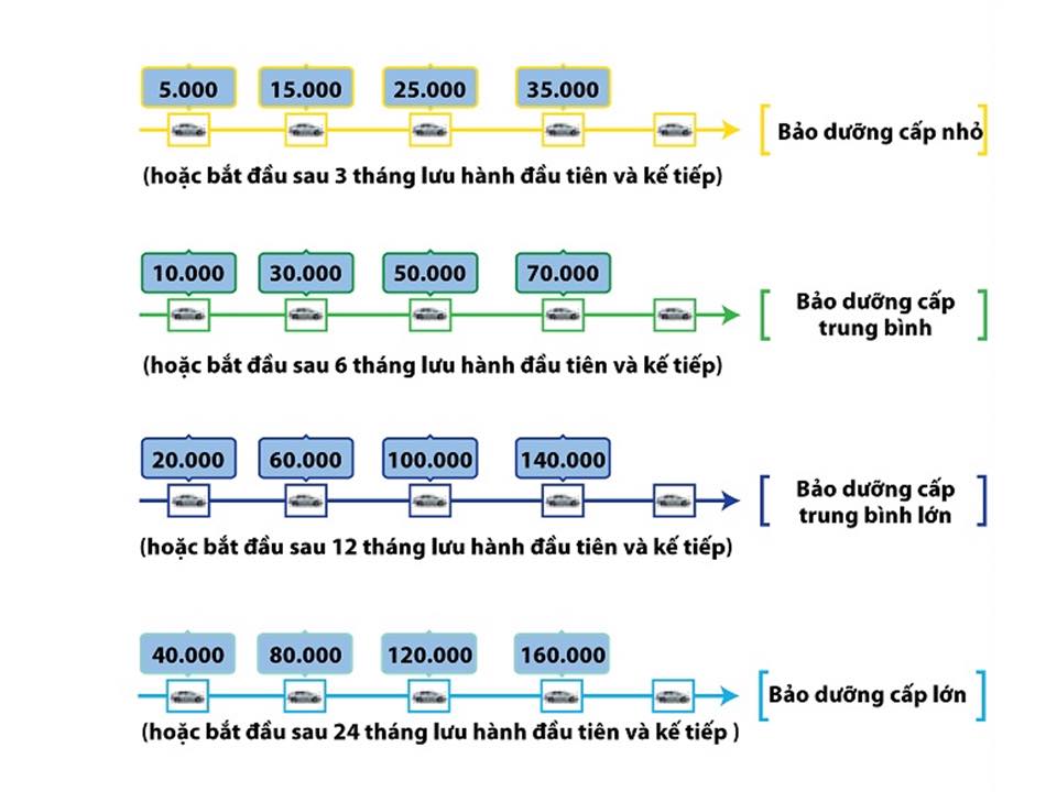 Để xe vận hành an toàn, bền bỉ, tránh hỏng vặt nhà máy khuyến nghị quý khách hàng nên mang xe tới các đại lý chính hãng để thực hiện công tác bảo dưỡng sau mỗi 5.000km xe chạy hoặc 3 tháng tùy thuộc điều kiện nào đến trước theo 04 cấp bảo dưỡng tương ứng sau đây.