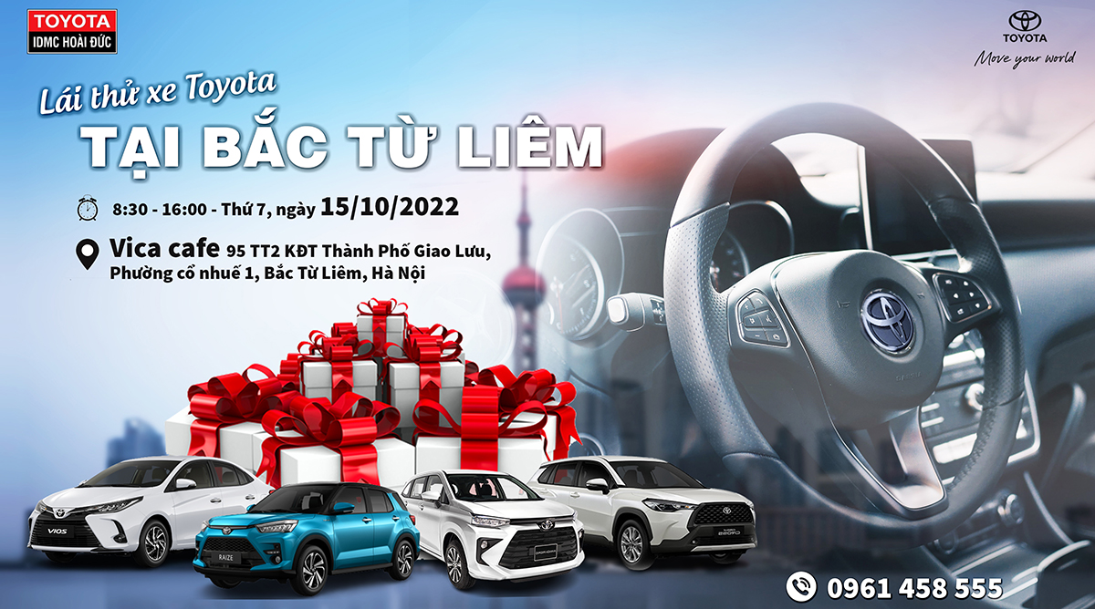 Tại khi đô thị Thành Phố Giao Lưu, Cổ Nhuế, quận Bắc Từ Liêm, Hà Nôi vào thứ 7 tuần này, Toyota Hoài Đức tổ chức sự kiện lái thử xe Toyota tại Bắc Từ Liêm với những dòng xe mới nhất, hot nhất. Tại sự kiện, quý KH sẽ được lái thử các dòng xe Toyota như: Veloz Cross, Raize, Cross, Vios.