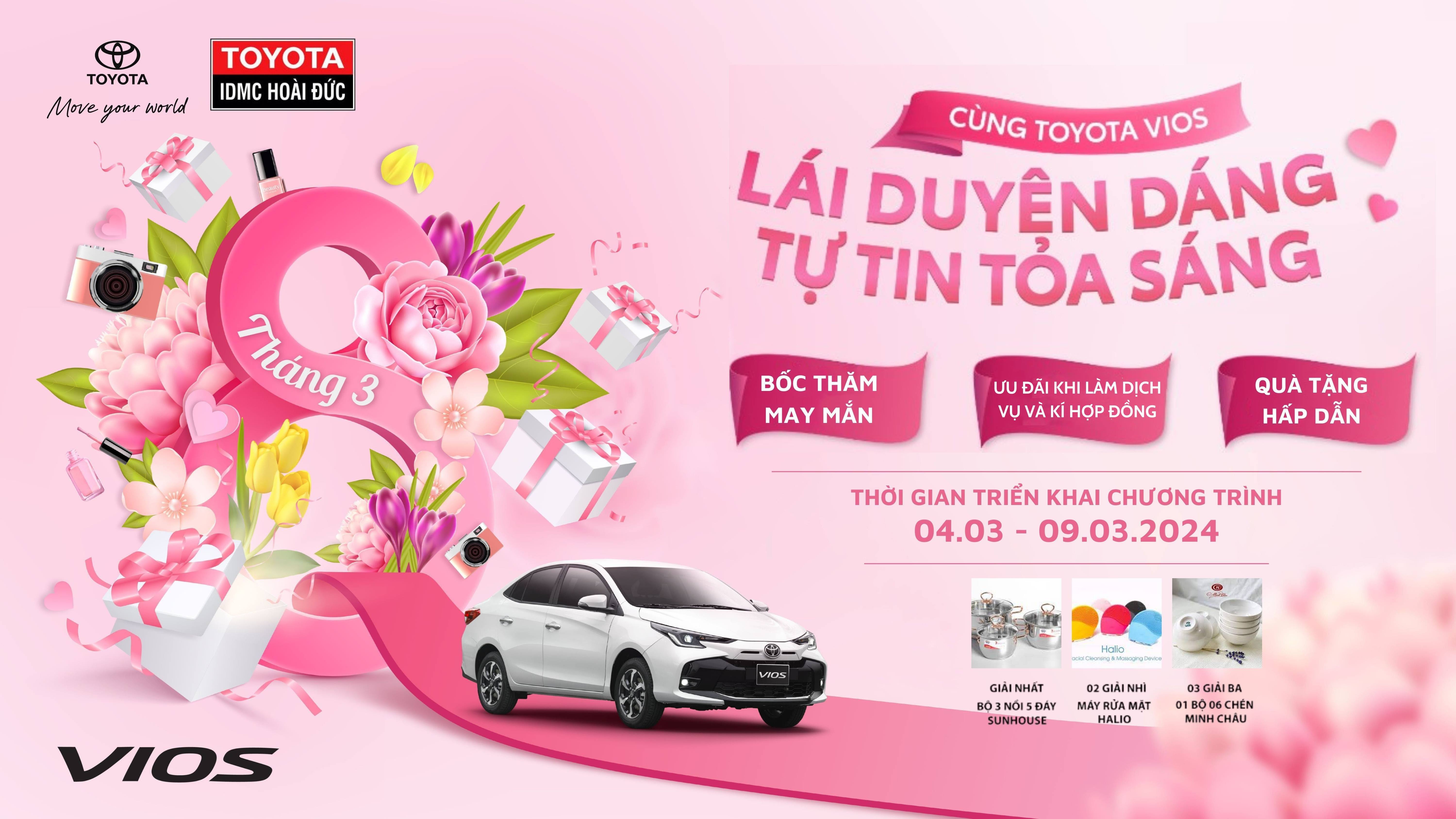 Cùng Toyota Hoài Đức dành tặng những yêu thương trọn vẹn, những tình cảm chân thành nhất tới một nửa thế giới qua tuần lễ vàng tôn vinh phái đẹp 8/3 năm nay, chúc chị em phụ nữ luôn xinh đẹp và thành công.