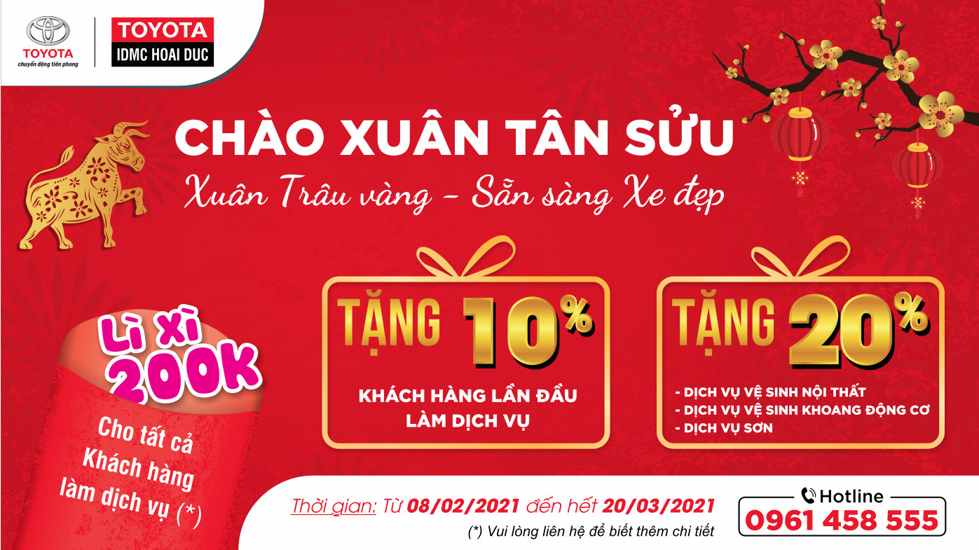 Nhân dịp đón xuân 2021, Toyota Hoài Đức gửi đến quý khách hàng chương trình Chào xuân Tân Sửu 2021 với những ưu đãi đặc biệt, lộc trồng lộc khi cho xế cưng đến sửa chữa, bảo dưỡng tại đại lý: