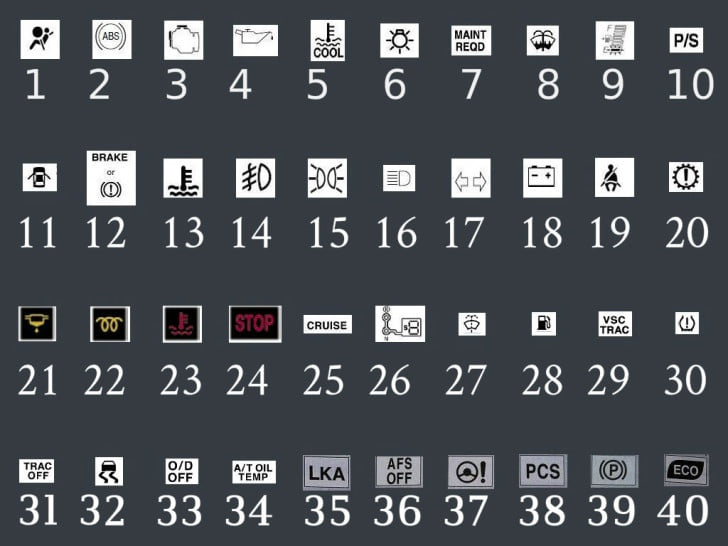 ĐÈN CẢNH BÁO TRÊN TÁP LÔ XE TOYOTA, Để vận hành xe an toàn bạn cần nắm rõ ý nghĩa của các loại đèn báo hiển thị trên táp lô xe để xử lý kịp thời khi lái xe. Bài viết dưới đây sẽ giúp các bạn nắm rõ ý nghĩa của 40 loại đèn báo có trên các dòng xe của Toyota.
