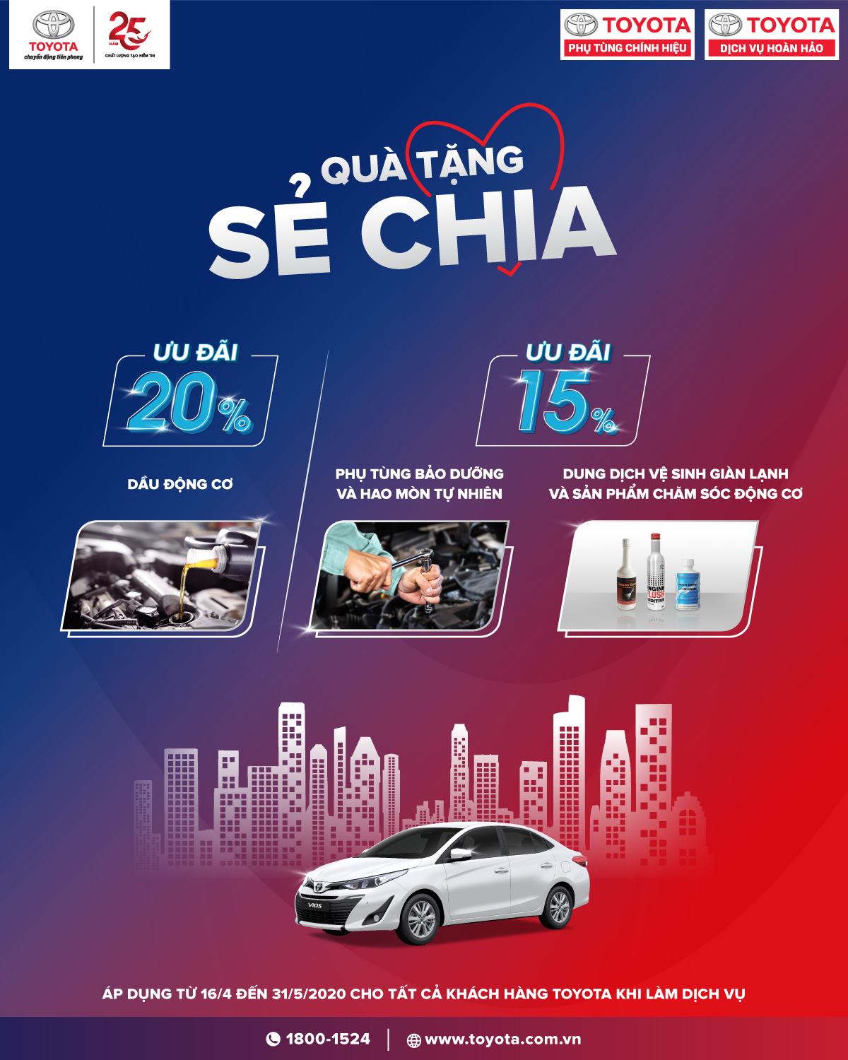 – Ưu đãi 20% giá bán lẻ niêm yết dầu động cơ Toyota khi sử dụng dịch vụ có phát sinh thay dầu động cơ