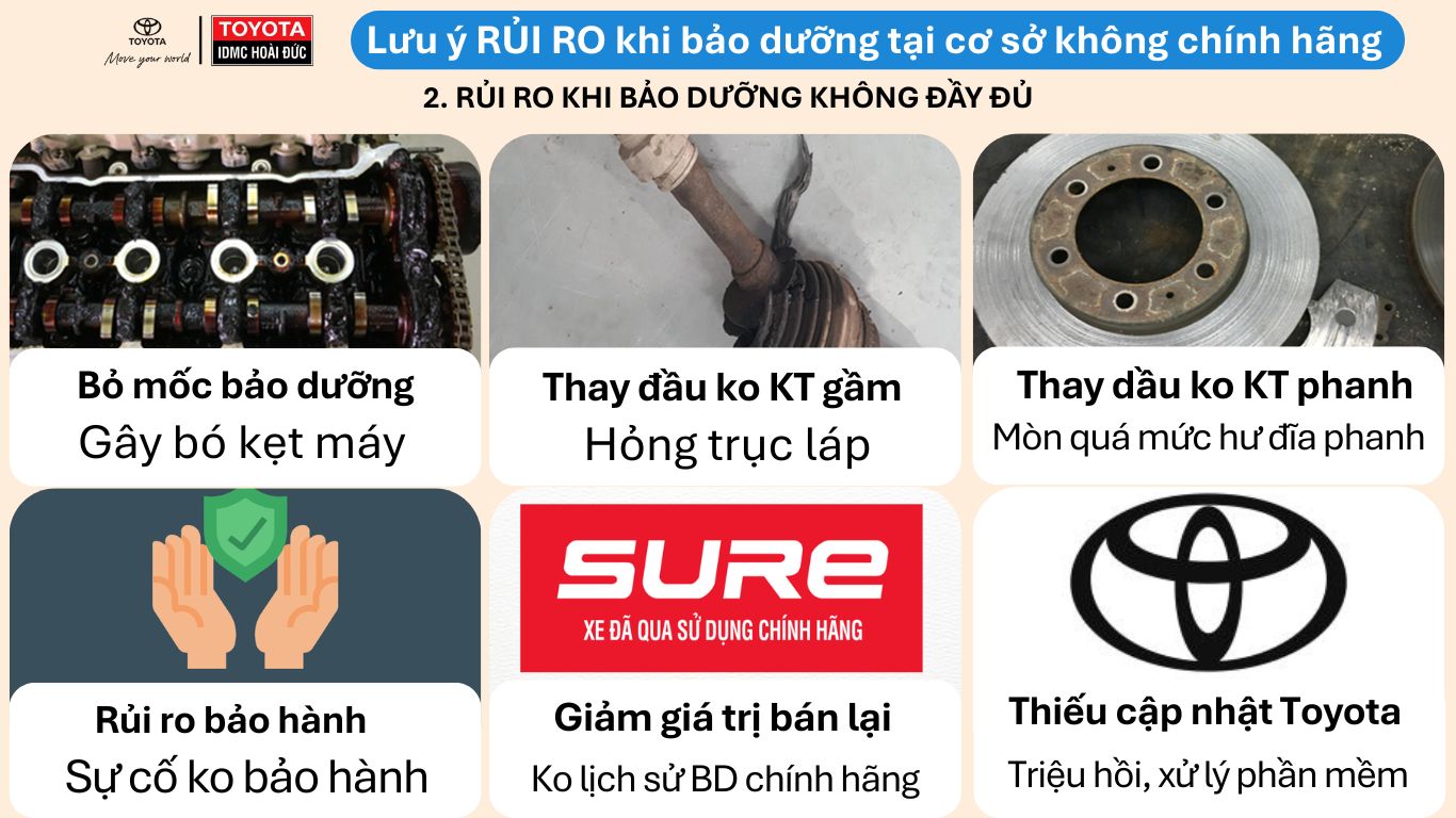 Việc  bảo dưỡng tại các cơ sở không chính hãng sẽ tiềm ẩn nhiều nguy cơ gây hại cho xế cưng. Cùng Toyota Hoài Đức làm rõ trong nội dung dưới đây: