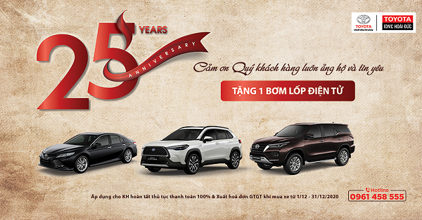 Để tri ân sự đồng hành của khách hàng với Toyota Việt Nam trong 25 năm qua và mừng lễ giáng sinh 2020, Toyota Hoài Đức xin thông báo tới Quý Khách hàng “SỰ KIỆN TRI ÂN KHÁCH HÀNG 2020” vào thứ 7 các tuần trong tháng 12, bắt đầu vào 5/12/2020, cụ thể: