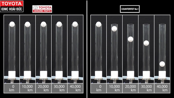 Và kết quả thật bất ngờ. Đối với bộ lọc chính hãng dù đi đến 40.000km mà bóng vẫn nằm nguyên 1 vị trí. Còn đối với bộ lọc giả thì quả bóng đã nằm ở tận dưới.