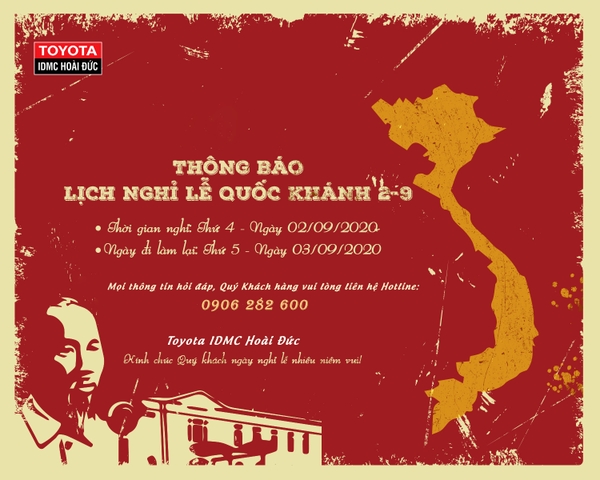 Toyota Hoài Đức xin thông báo tới Quý Khách hàng “THÔNG BÁO LỊCH NGHỈ LỄ QUỐC KHÁNH 2-9” như sau: