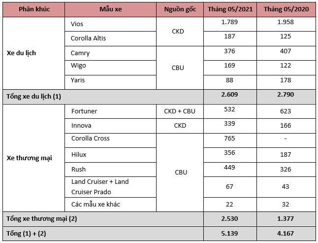 Tháng 05/2021, doanh số xe lắp ráp trong nước của Toyota đạt 2.781 xe, chiếm 54% doanh số Toyota Việt Nam. Doanh số các mẫu xe nhập khẩu đạt 2.358 xe.