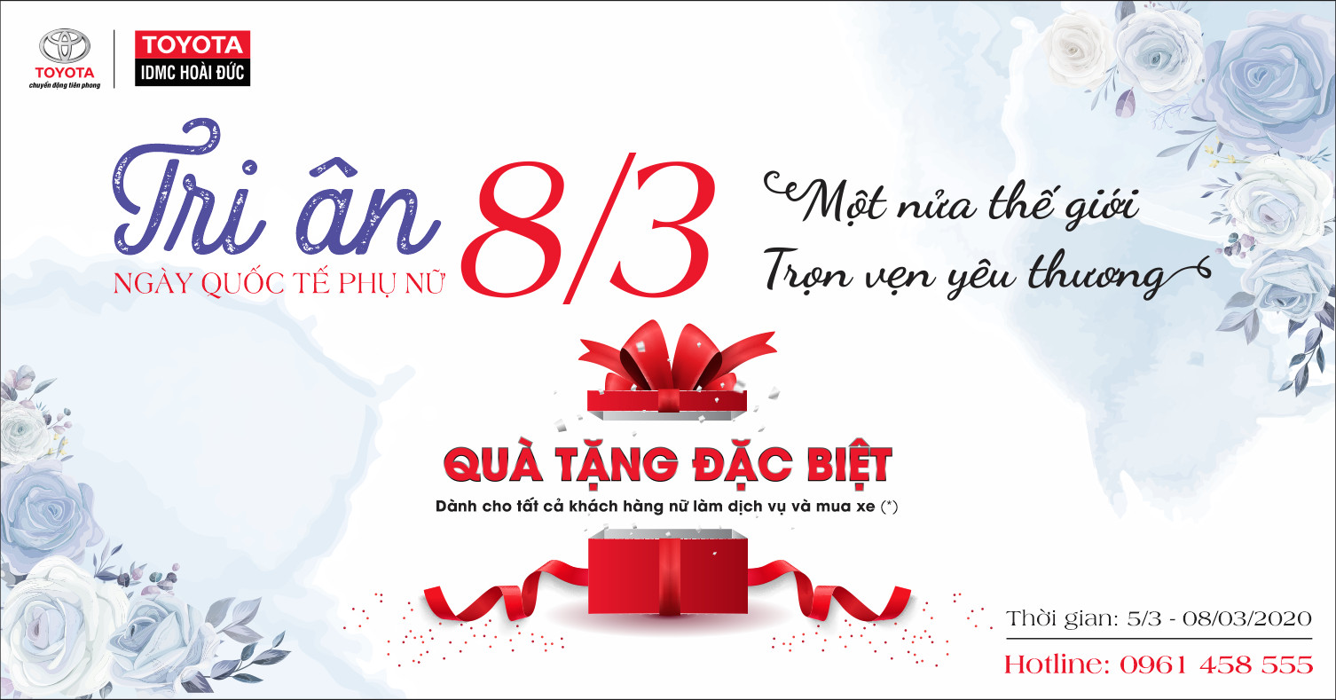 Từ 5/3 đến 8/3, Để Tri ân ngày Quốc tế Phụ nữ 8-3, tất cả khách hàng nữ đến Toyota Hoài Đức đều nhận được những phần quà hết sức thiết thực cho một nửa thế giới khi ghé thăm Đại lý sử dụng dịch vụ (mua xe/ làm bảo dưỡng/ sửa chữa). Cụ thê: