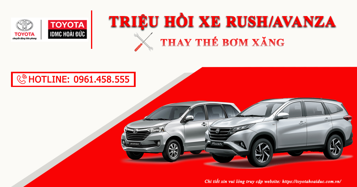 Trước hết, chúng tôi xin cảm ơn sự tin dùng của Quý khách đối với hãng xe Toyota nói chung và dòng xe Rush/ Avanza nói riêng. Để đảm bảo vận hành an toàn, Toyota xin thông báo tới quý khách chiến dịch triệu hồi mở rộng TRIỆU HỒI XE RUSH/AVANZA THAY THẾ BƠM XĂNG