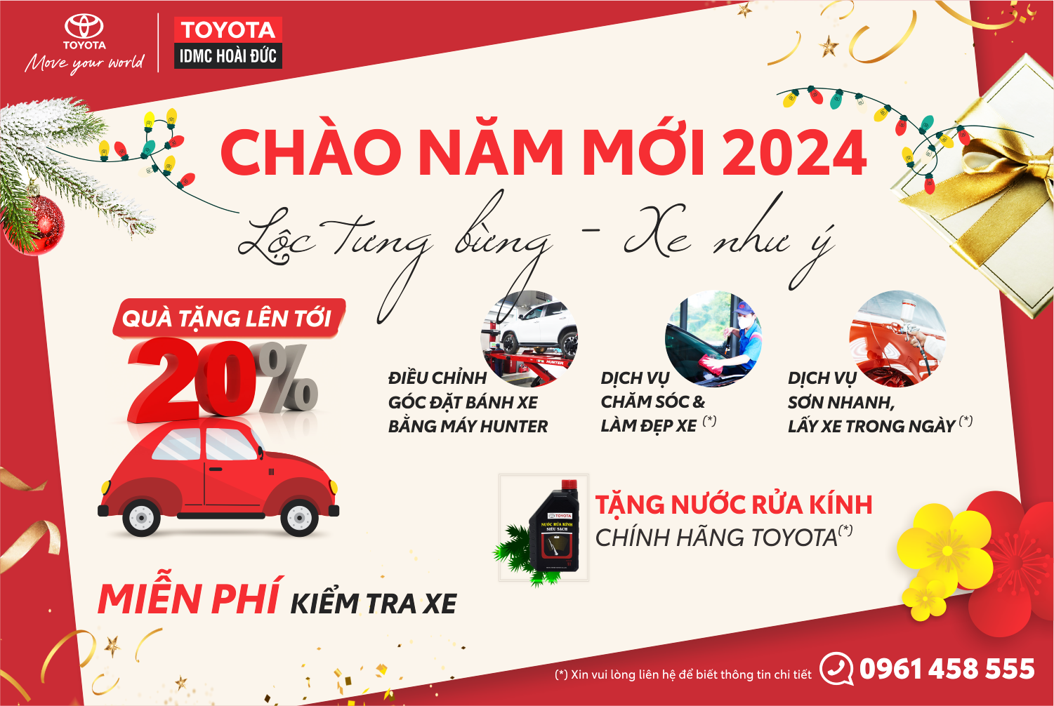 Chào đón năm mới 2024, Toyota Hoài Đức xin gửi đến quý khách hàng những món quà vô cùng hấp dẫn dành cho dịp cuối năm 2023. Chương trình sẽ bắt đầu từ ngày 9/12 dành cho tất cả khách hàng sử dụng dịch vụ tại Toyota Hoài Đức bao gồm: