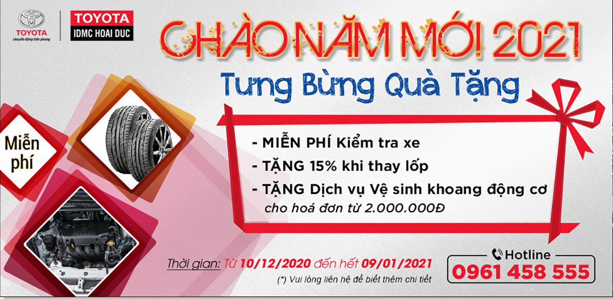 Nhân dịp cuối năm 2020, để tri ân khách hàng đã đồng hành cùng đại lý, Toyota IDMC Hoài Đức thông báo triển khai chiến dịch Dịch vụ “ƯU ĐÃI LÀM DỊCH VỤ” với rất nhiều ưu đãi khi quý khách cho xế cưng đến Toyota Hoài Đức để “làm đẹp” trong thời gian từ Thứ Năm 10/12/2020 đến hết Thứ Bảy 09/01/2021.