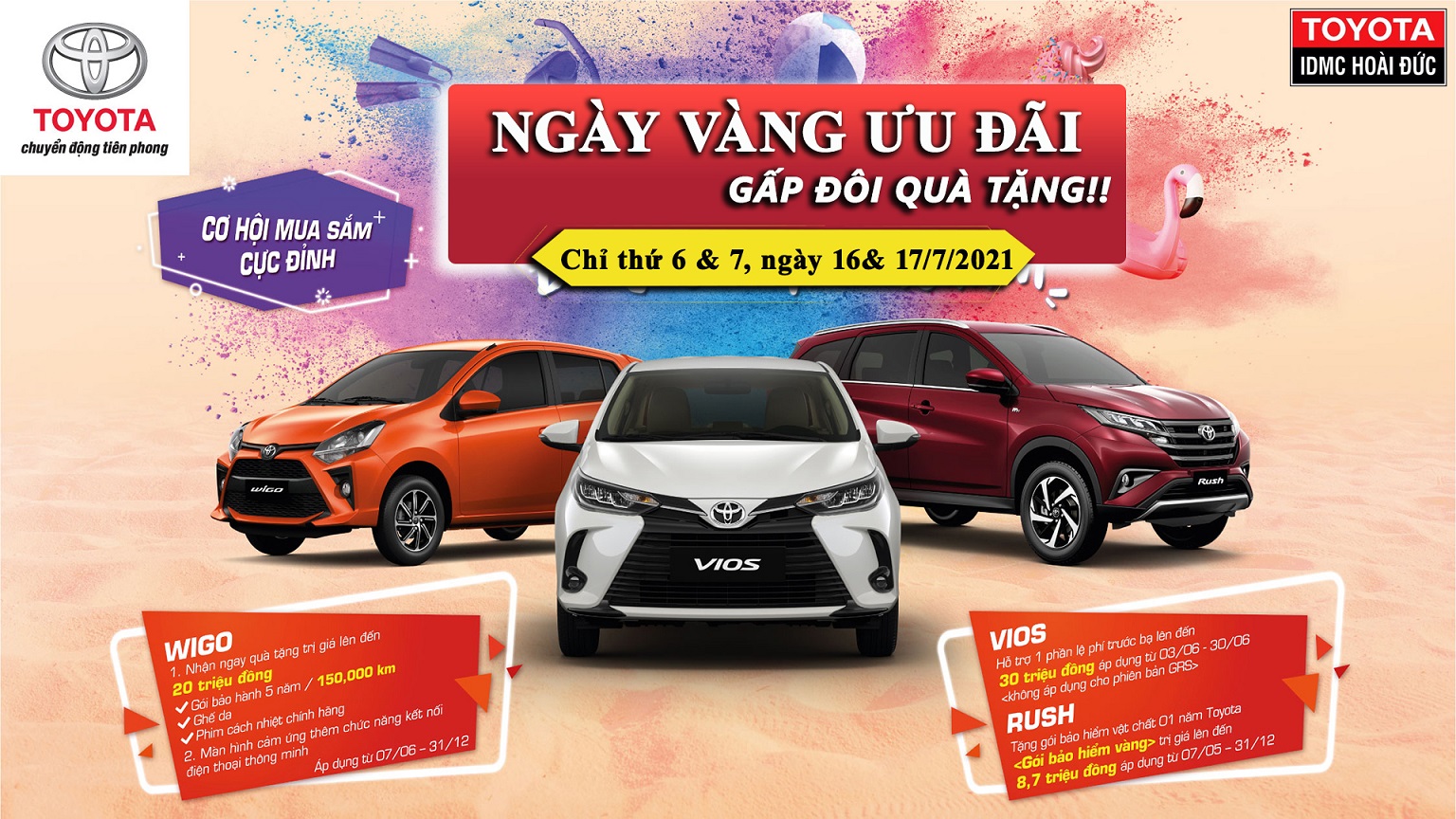 Để tri ân quý khách hàng đã ủng hộ Toyota Hoài Đức quan tâm trong thời gian vừa qua, Đại lý triển khai chương trình NGÀY VÀNG ƯU ĐÃI vào 16 & 17/7/2021 tức thứ 6 & 7 tuần này với những ưu đãi cực hấp dẫn chỉ có trong ƯU ĐÃI VÀNG: